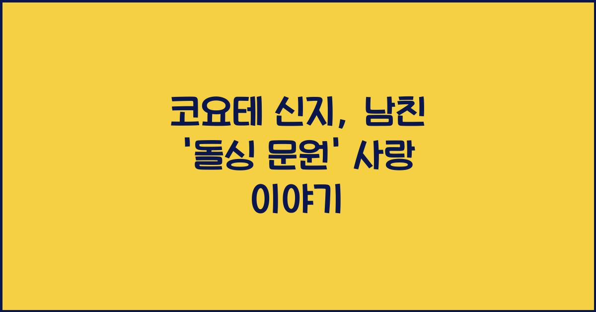 코요테 신지, 그 이름을 듣고 여러분은 어떤 생각이 드시나요? 아마도 그녀의 독특한 음색과 끼있는 무대 매력을 떠올릴 것입니다. 하지만 그녀의 사랑 이야기도 결코 빼놓을 수 없죠. 최근 코요테 신지와 남친 '돌싱 문원'의 사랑 이야기가 많은 이들의 입에 오르내리고 있습니다. 이 둘은 어떻게 만나게 되었으며, 그들의 사랑은 어떤 모습일까요? 와, 정말 많은 궁금증이 풀리게 될 것 같습니다!